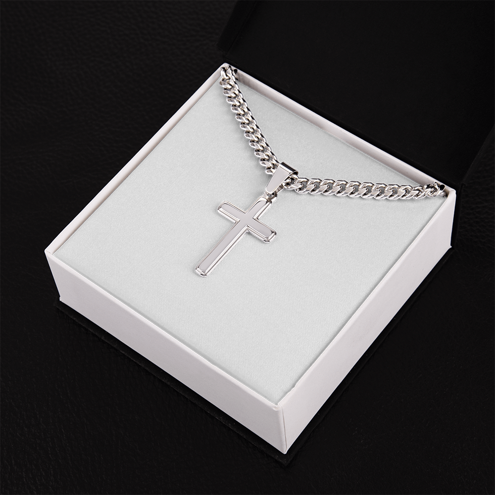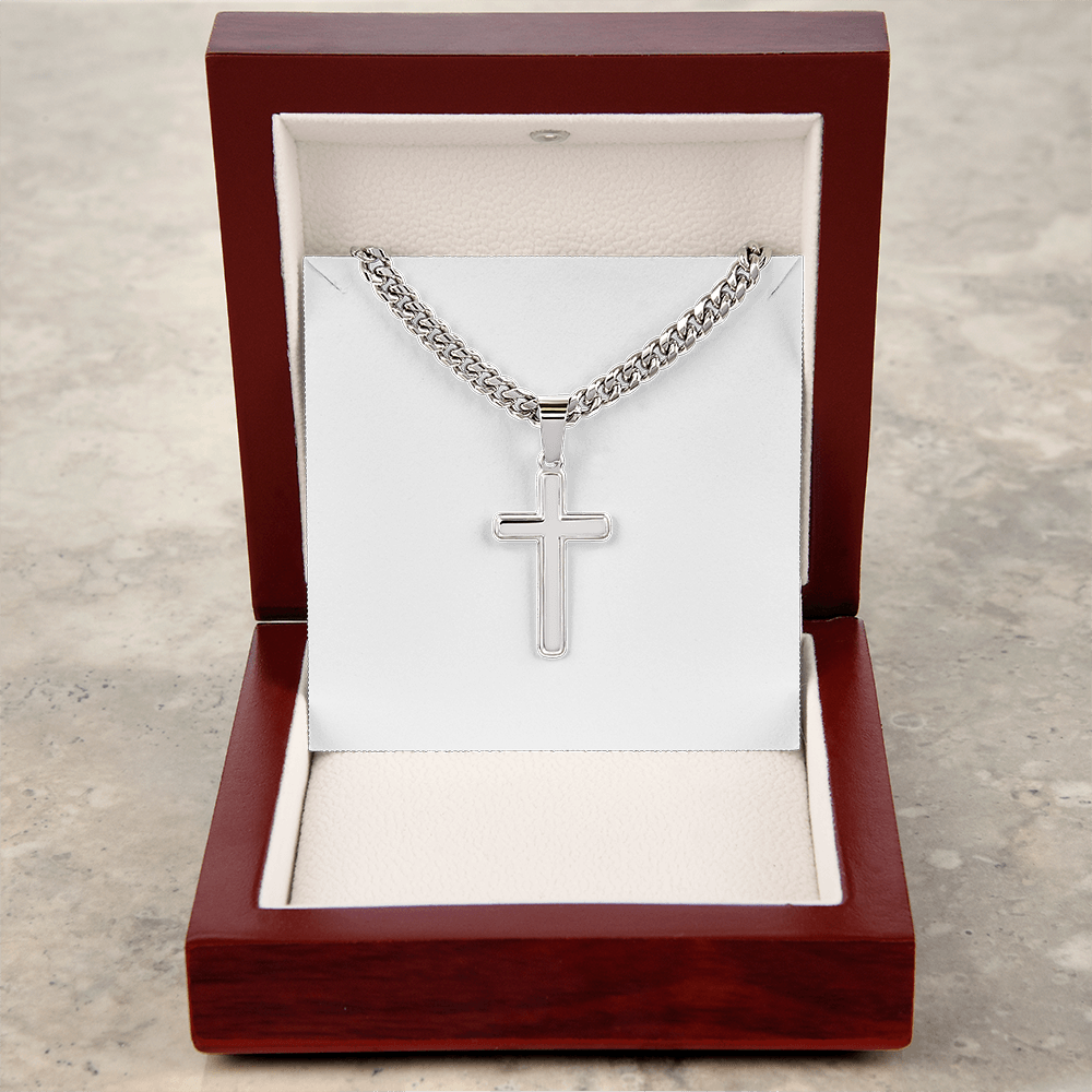 Portez votre foi avec fierté avec ce Collier de chaîne cubaine avec pendentif de croix d'artisan. Parfait pour les occasions spéciales ou le port quotidien, ceci fait une merveilleuse idée de cadeau pour vous ou votre être cher. La personnalisation de l'arrière du pendentif de croix rendra certainement ce cadeau précieux pendant des années à venir !